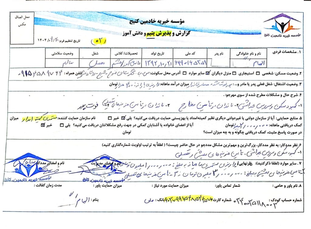 اکنون الهام منتظر حمایت مستمر شما یاوران گرامی است . تا بتواند بخش کوچکی از نیازهای روز مرگی اش را تامین کند .