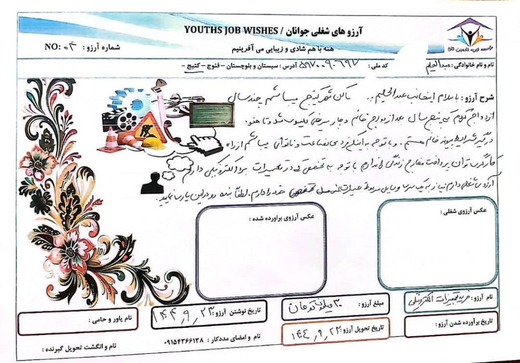 در استان سیستان و بلوچستان در شهر کتیج شهر جوانان خلاق با اراده ی قوی ، فردی به نام عبدالحلیم زندگی می کند اما با توجه به گذشت ۵ سال از ازدواجش و بیماری کلیوی همسرش که به تازگی تحت درمان پیوند کلیوی قرار گرفته است با شرایط سختی زندگی می کند و اینکه عبدالحیلم شخصی فنی کار در تعمیرات لوازم الکترونیکی می باشد . آرزوی شغلی دارد که لوازم و ابزار کار مربوط به تخصصی که دارد را داشته باشد تا با آن زندگی خود را اداره و تامین کند .
